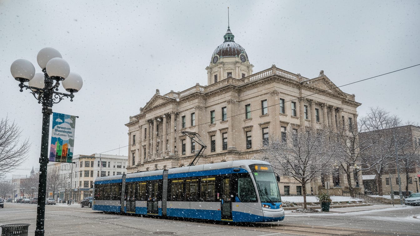 The car rattled and swayed as it moved through downtown Bloomington, past the distinctive architecture of the old commercial district, brick buildings from the late 1800s, some renovated into cooperative stores and restaurants, others still waiting for new purposes.